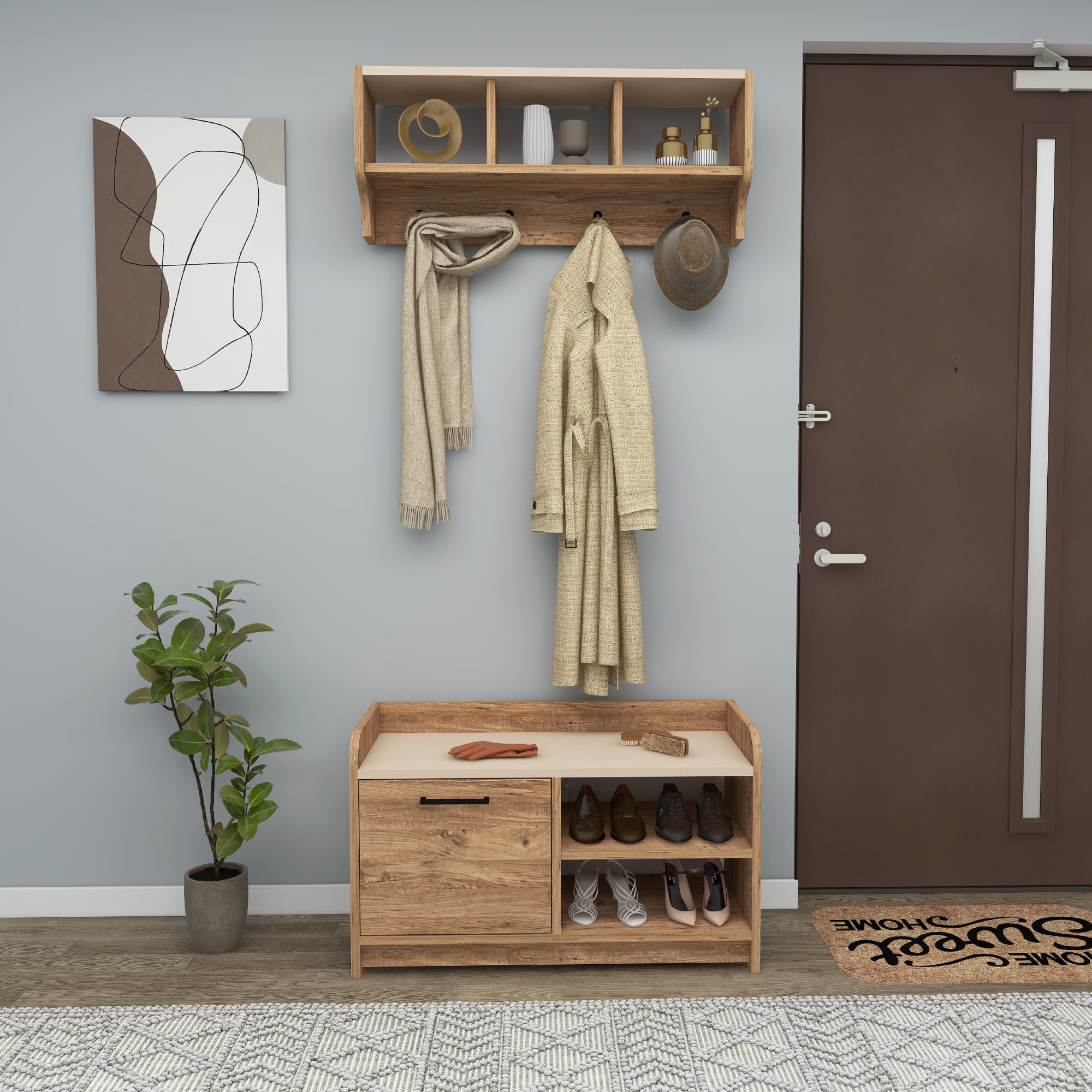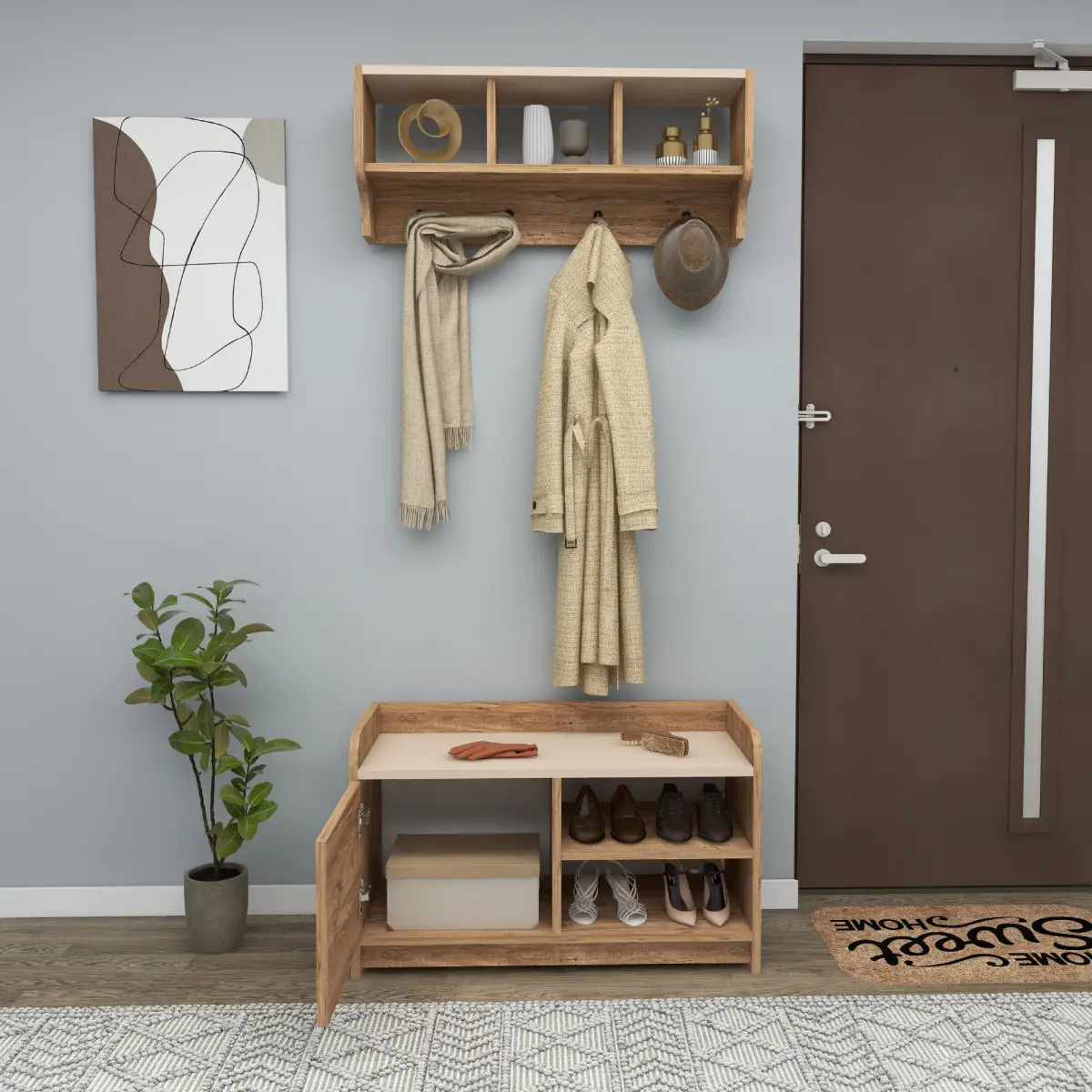 Our sleek and stylish modern hallway coat rack is the perfect solution for keeping your entryway tidy and chic. With its six-tier open shelves, this coat rack provides ample space to showcase your shoes, bags, and everyday essentials, adding a touch of elegance to your hallway. The thoughtful design includes a cabinet for closed storage, keeping your items organized and hidden from view. Embrace the modern allure of our Hallway Coat Rack and transform your space into a functional and fashionable haven.