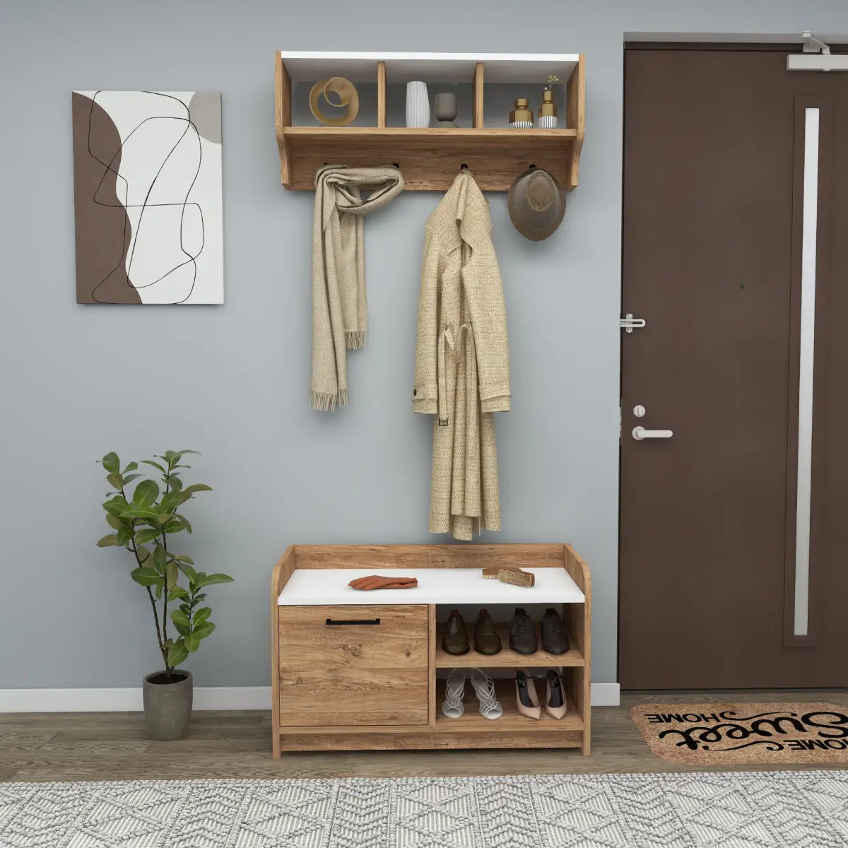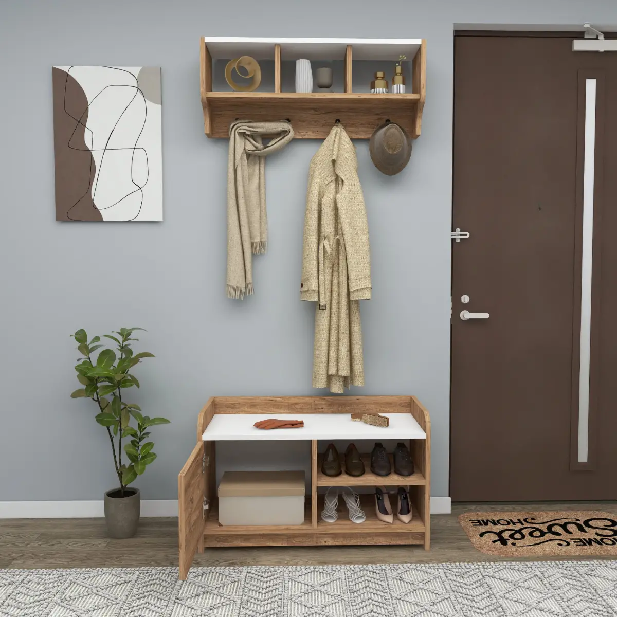 Our sleek and stylish modern hallway coat rack is the perfect solution for keeping your entryway tidy and chic. With its six-tier open shelves, this coat rack provides ample space to showcase your shoes, bags, and everyday essentials, adding a touch of elegance to your hallway. The thoughtful design includes a cabinet for closed storage, keeping your items organized and hidden from view. Embrace the modern allure of our Hallway Coat Rack and transform your space into a functional and fashionable haven.