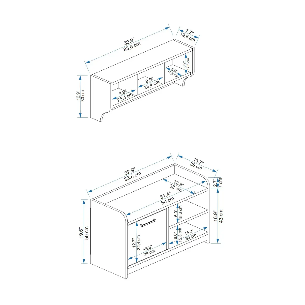 UPPER COMPARTMENT HEIGHT: 12.9" / 33 cm | WIDTH: 32.9" / 83.6 cm | DEPTH: 7.7" /19.6 cm.