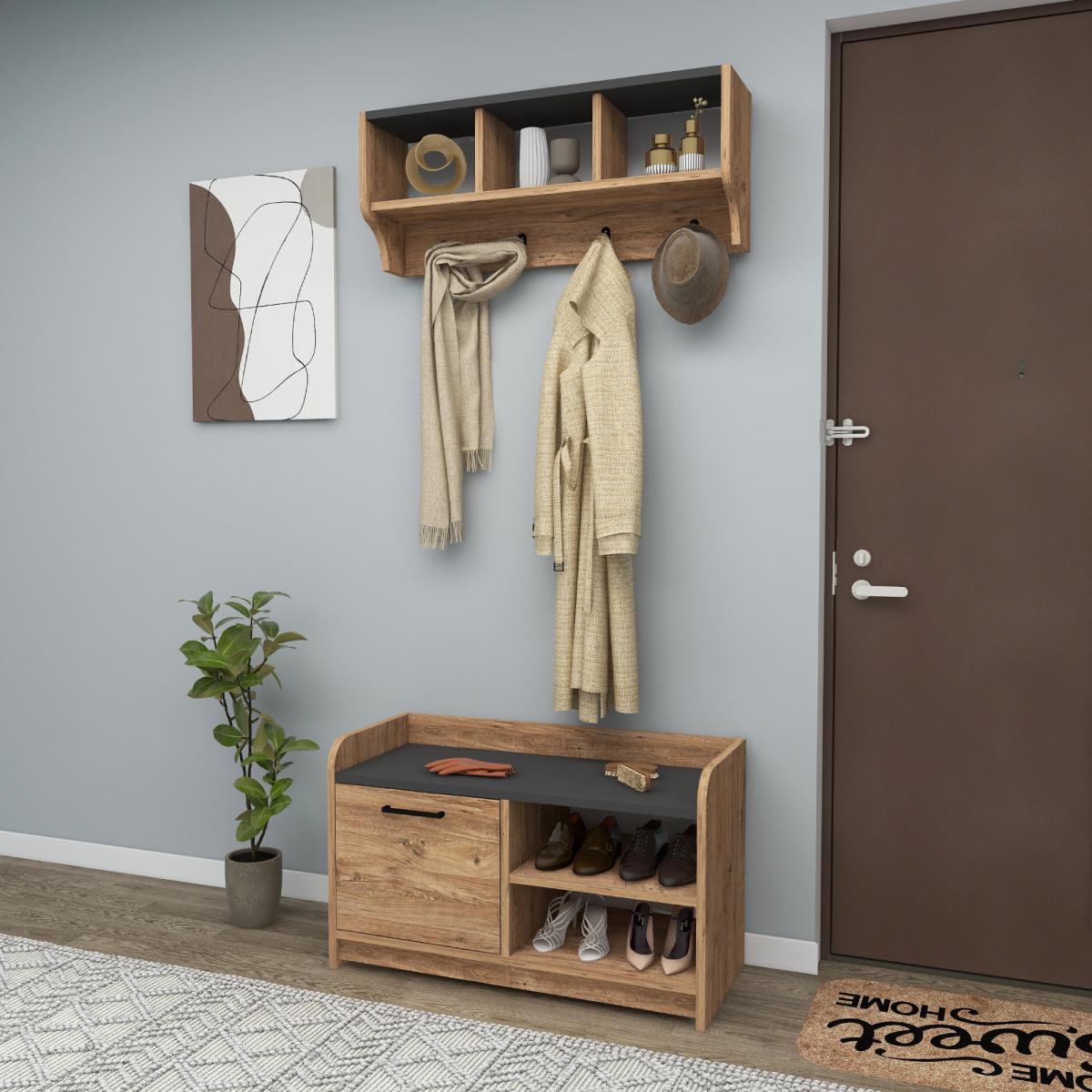 MATERIAL: The coat rack is made of an 18 mm thick quality melamine-coated particleboard. The manufactured wood surface is water-resistant to some extent and the edges are banded with PVC edge banding tape. Hooks are quality iron metal. First-class assembly/installation hardware and accessories are used. Our products are produced from certified raw materials that do not contain carcinogenic substances and comply with European Union health norms.
