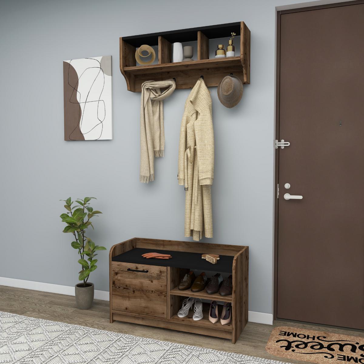 MATERIAL: The coat rack is made of an 18 mm thick quality melamine-coated particleboard. The manufactured wood surface is water-resistant to some extent and the edges are banded with PVC edge banding tape. Hooks are quality iron metal. First-class assembly/installation hardware and accessories are used. Our products are produced from certified raw materials that do not contain carcinogenic substances and comply with European Union health norms.
