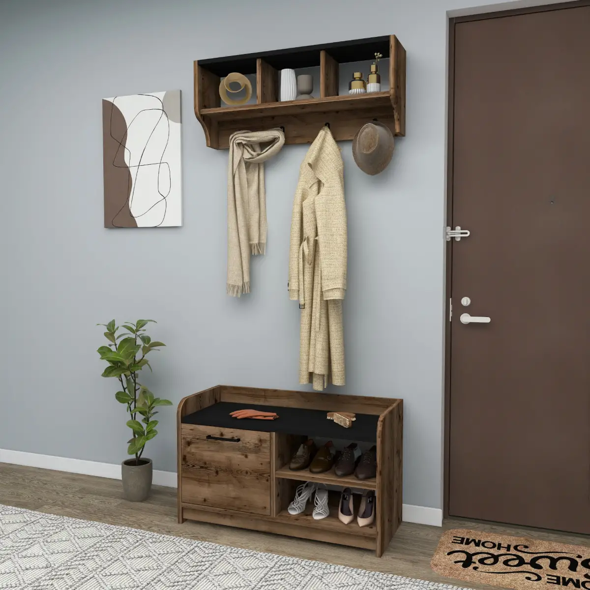 Our sleek and stylish modern hallway coat rack is the perfect solution for keeping your entryway tidy and chic. With its six-tier open shelves, this coat rack provides ample space to showcase your shoes, bags, and everyday essentials, adding a touch of elegance to your hallway. The thoughtful design includes a cabinet for closed storage, keeping your items organized and hidden from view. Embrace the modern allure of our Hallway Coat Rack and transform your space into a functional and fashionable haven.