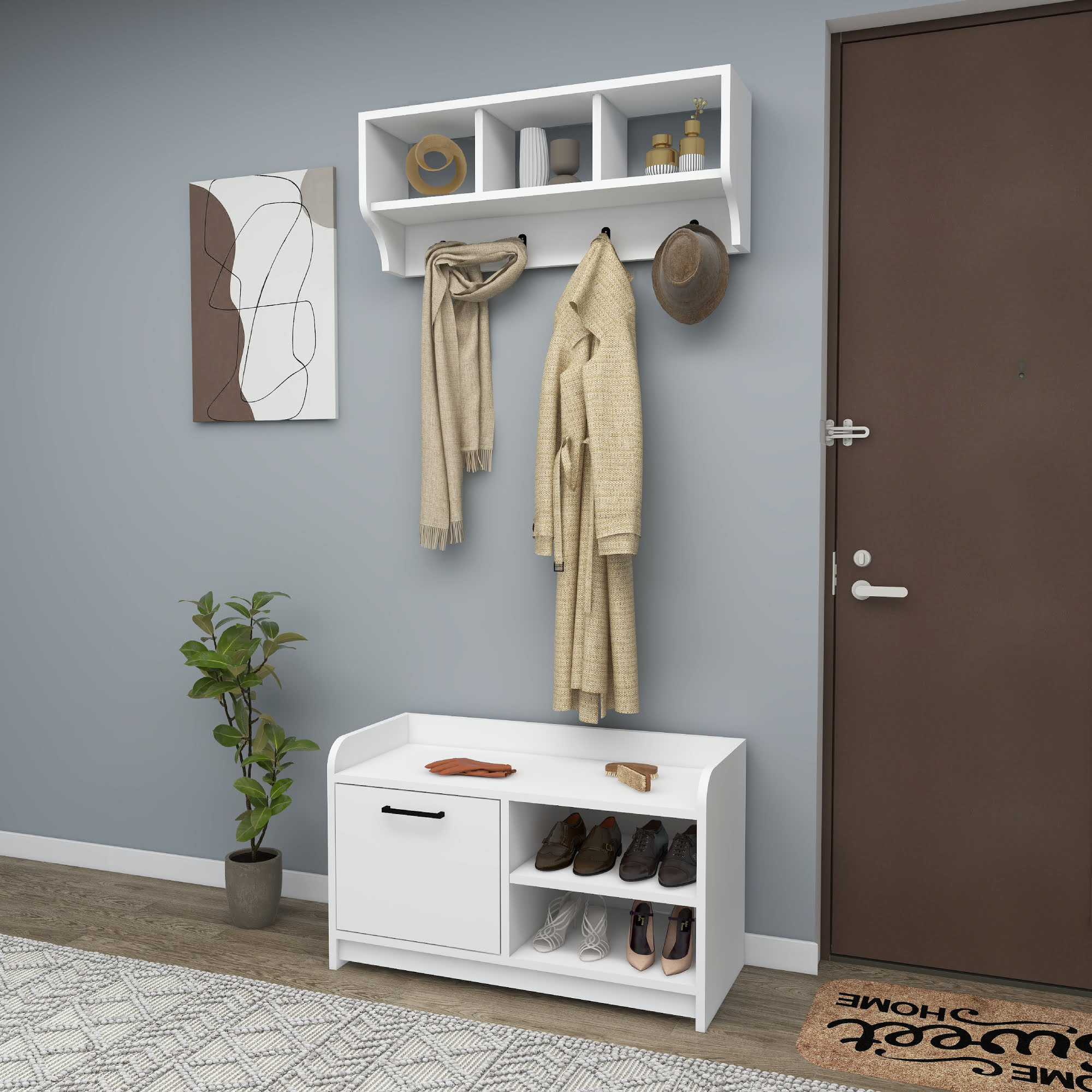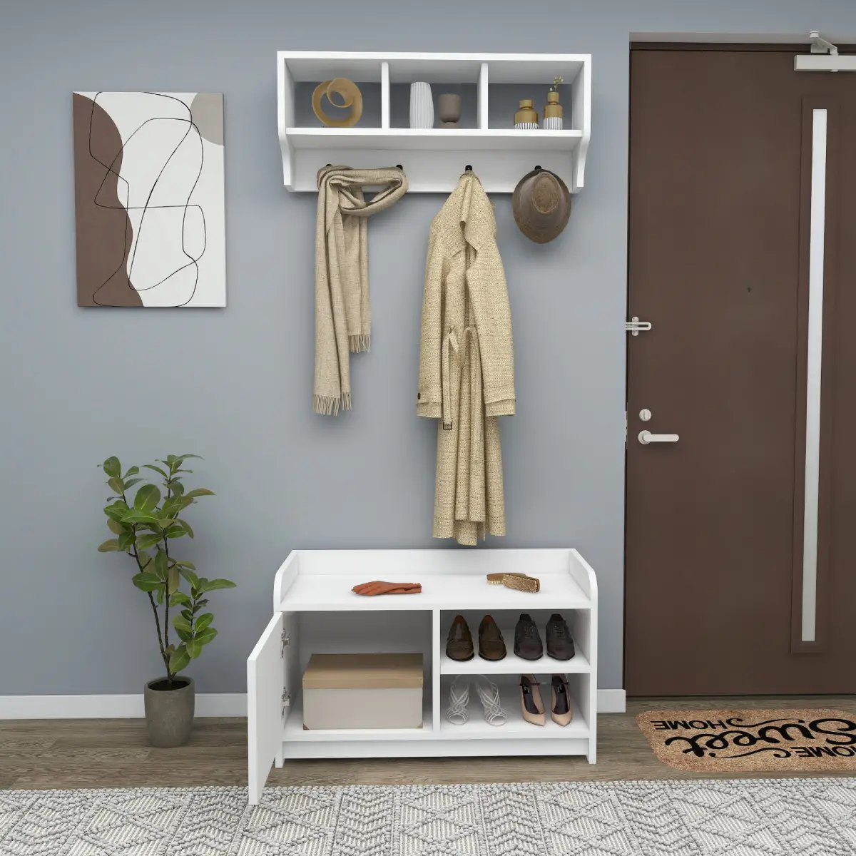 Our sleek and stylish modern hallway coat rack is the perfect solution for keeping your entryway tidy and chic. With its six-tier open shelves, this coat rack provides ample space to showcase your shoes, bags, and everyday essentials, adding a touch of elegance to your hallway. The thoughtful design includes a cabinet for closed storage, keeping your items organized and hidden from view. Embrace the modern allure of our Hallway Coat Rack and transform your space into a functional and fashionable haven.