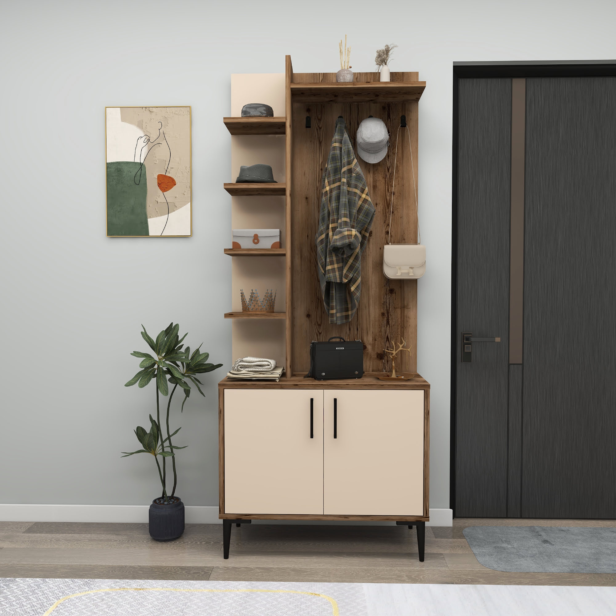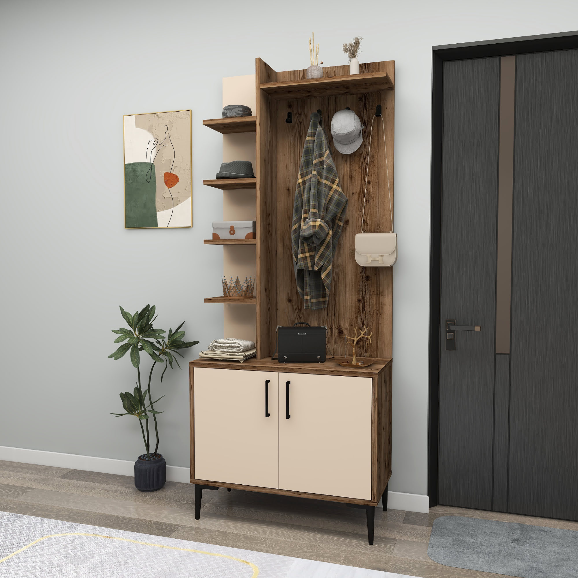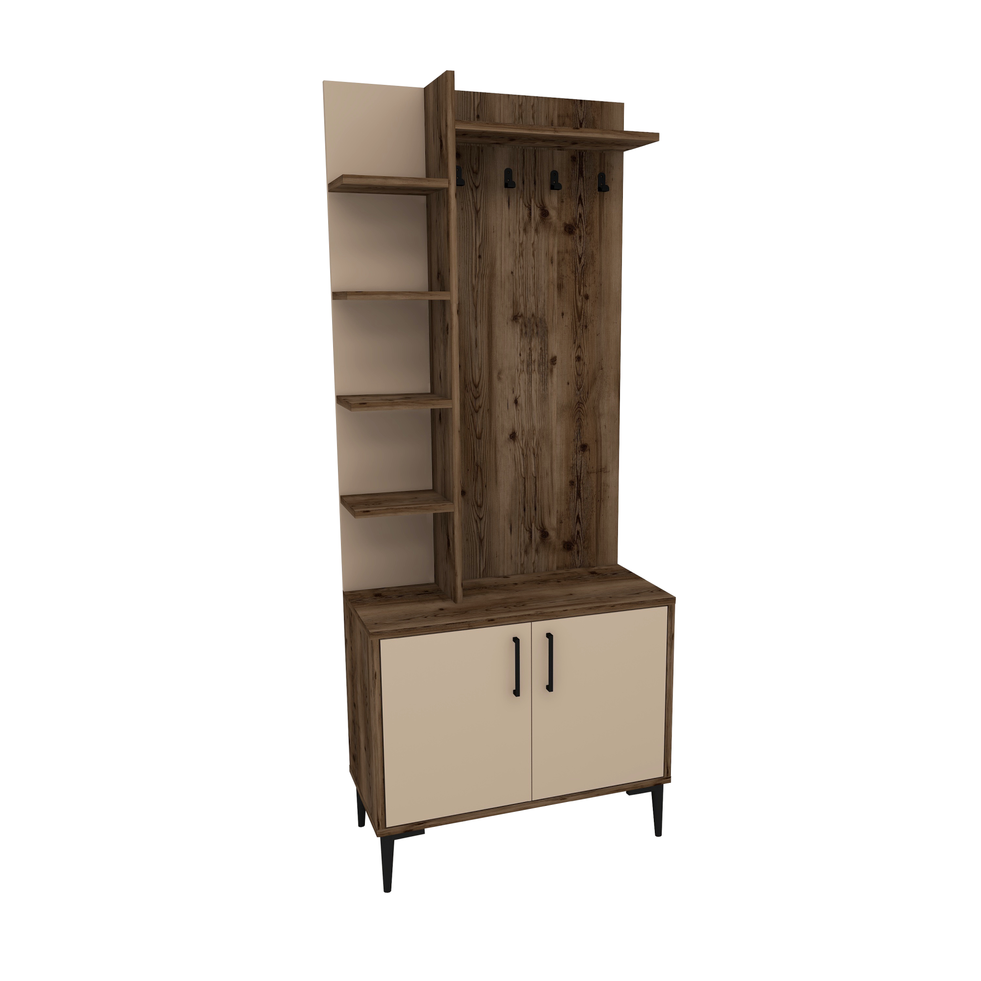 Lefteris Hallway Coat Rack with Shelves - Light Walnut & Beige