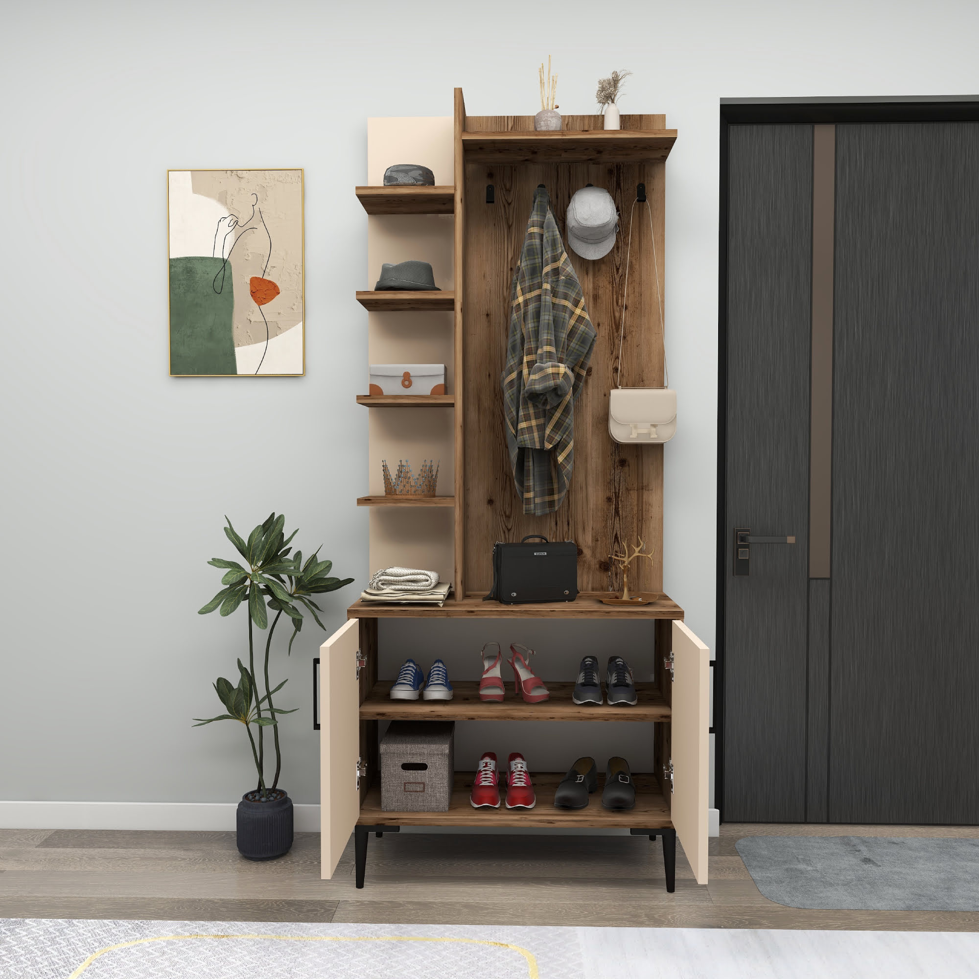 Our chic and versatile Modern Hallway Coat Rack – is the perfect solution for keeping your entryway tidy and organized. With its six-tier open shelves, you can stylishly store and display your shoes, bags, and everyday essentials, making it a practical and elegant addition to any hallway. The four sturdy metal hooks offer ample space to hang coats, hats, and scarves, ensuring easy access when you're on the go. Our thoughtful design includes a cabinet with two interior shelves, providing concealed storage for items you want to keep out of sight. Say goodbye to hallway clutter and embrace the beauty of organization with our Modern Hallway Coat Rack – where functionality meets contemporary style.