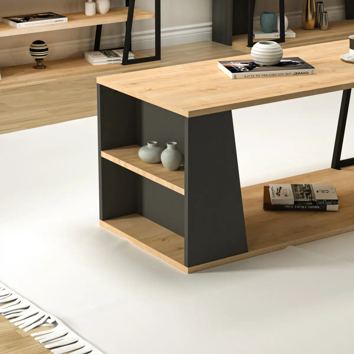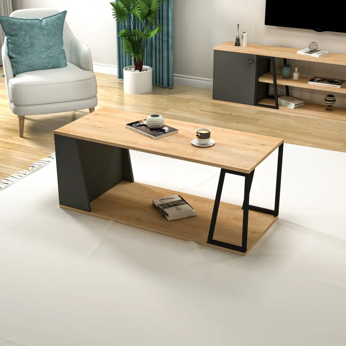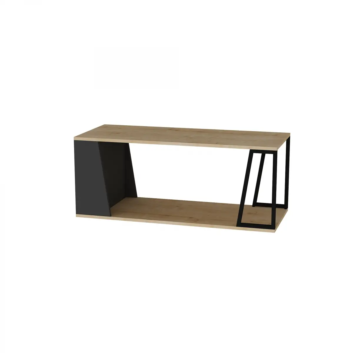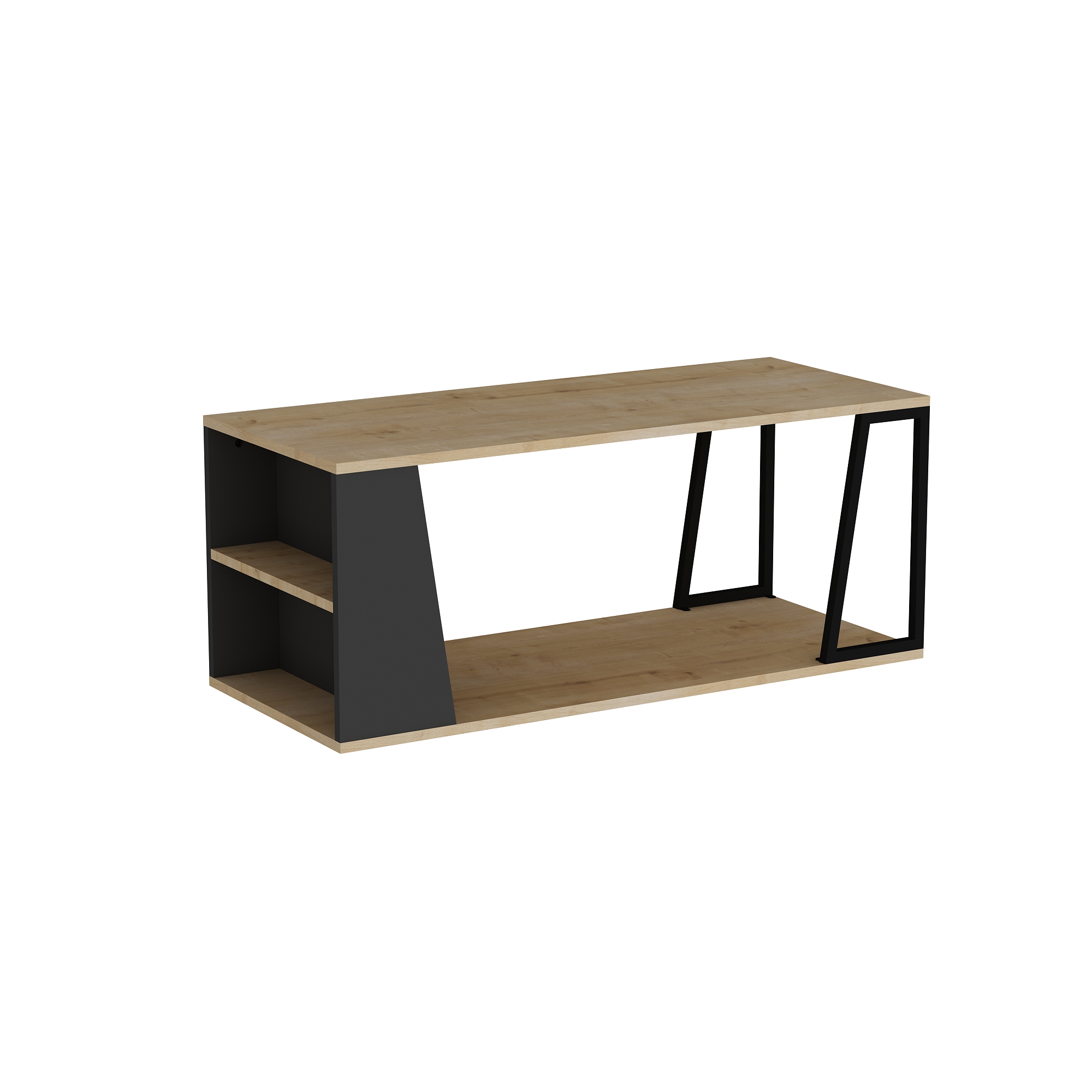 Lissa Coffee Table with Iron Legs and Shelves - Sapphire Oak & Anthracite