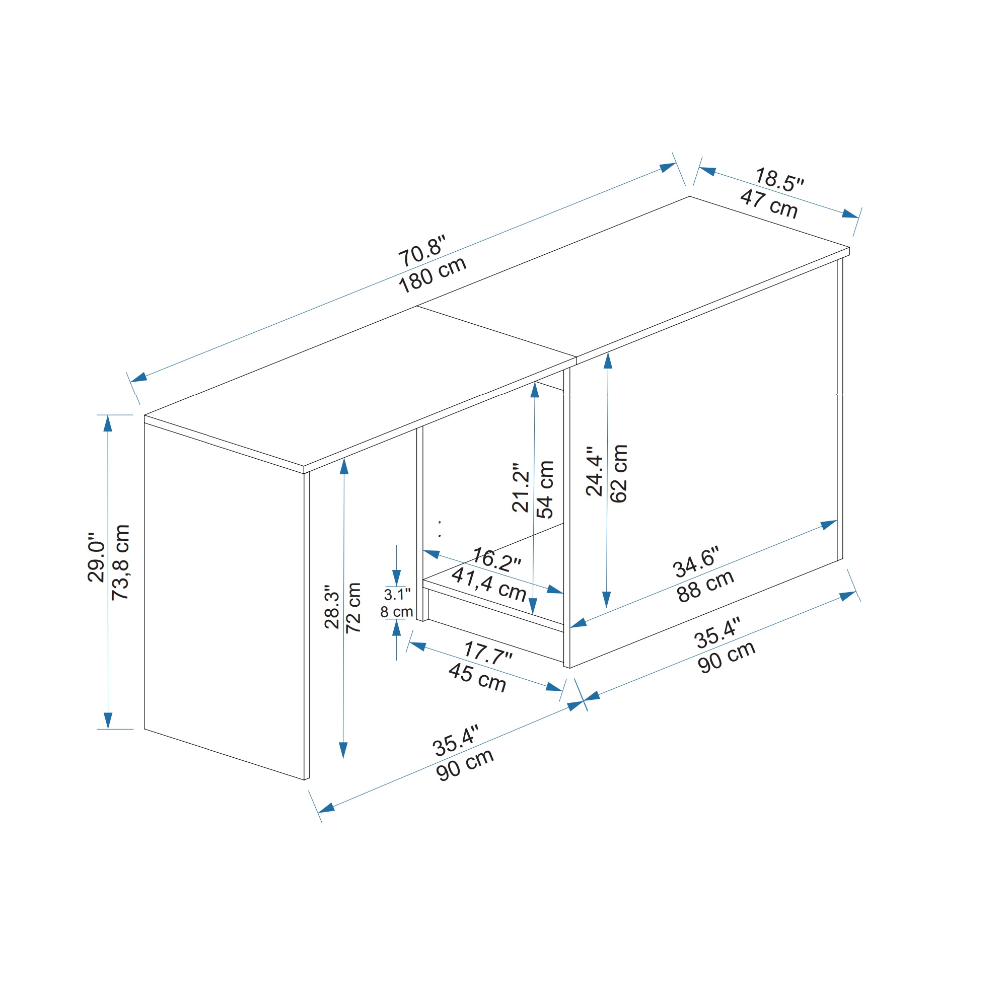 HEIGHT: 29" / 73.8 cm | WIDTH: 70." / 180 cm | DEPTH: 18.5" / 47 cm.