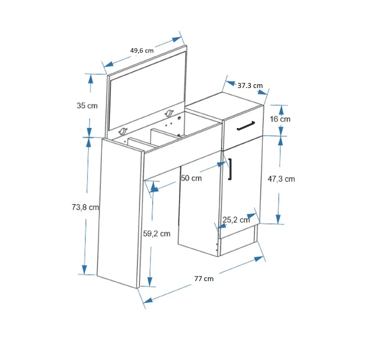 MATERIAL: The makeup table is made of an 18 mm thick high-quality melamine coated particleboard. The manufactured wood surface is water-resistant to some extent and edges are banded with PVC edge banding tape. Handles are quality iron metal. First-class assembly/installation hardware and accessories are used. Our products are produced from E1 certified raw materials that do not contain carcinogenic substances and comply with European Union health norms.