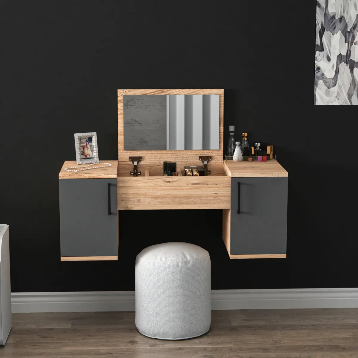 Marie Wall Mounted Makeup Vanity Table with Mirror - Atlantic Pine & Anthracite