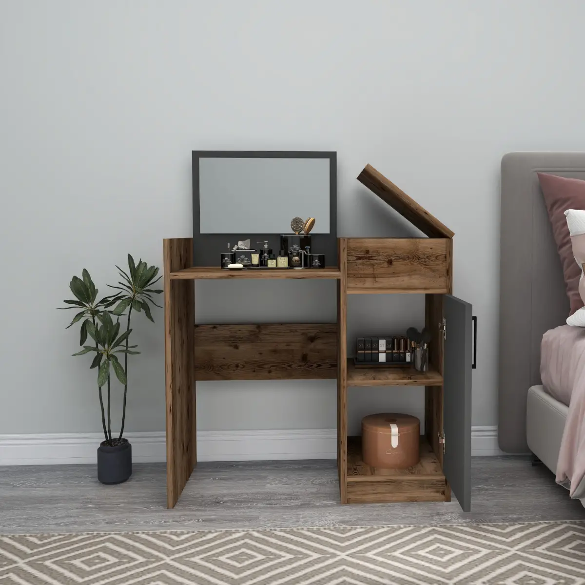 Sedef Makeup Vanity Table - Light Walnut & Anthracite
