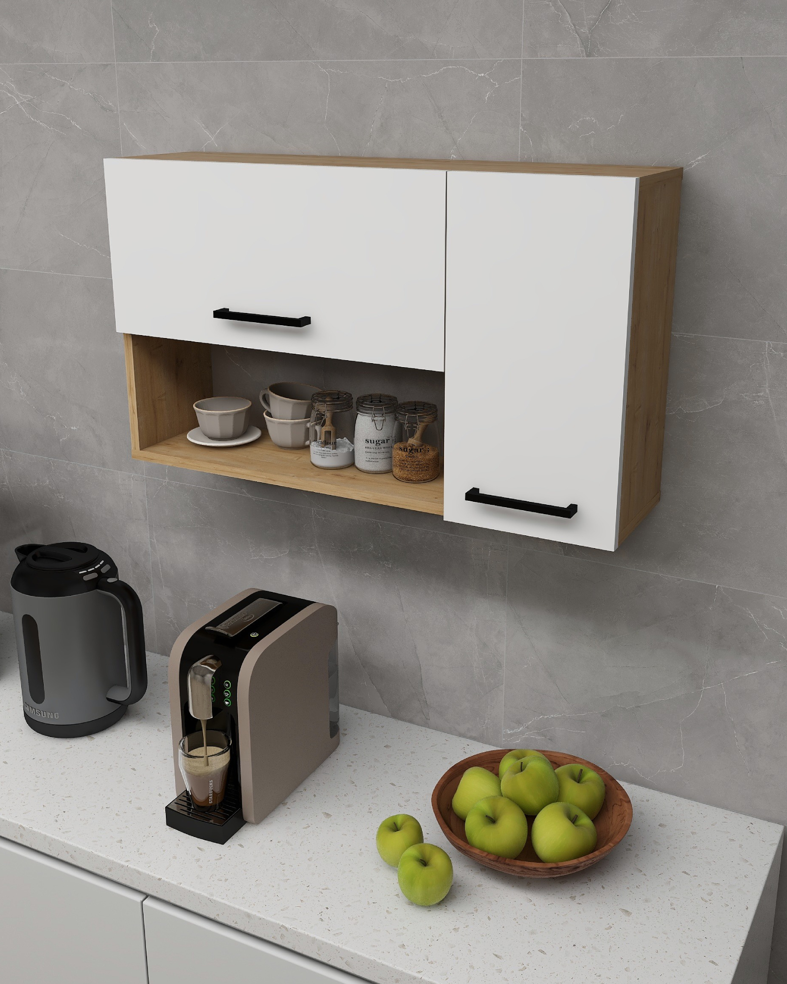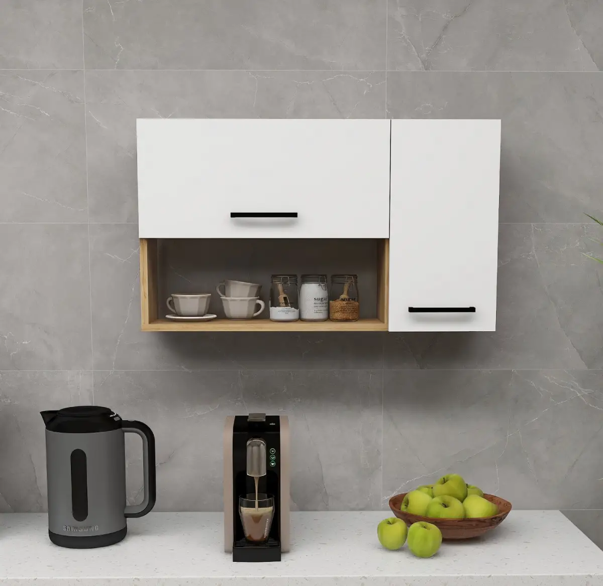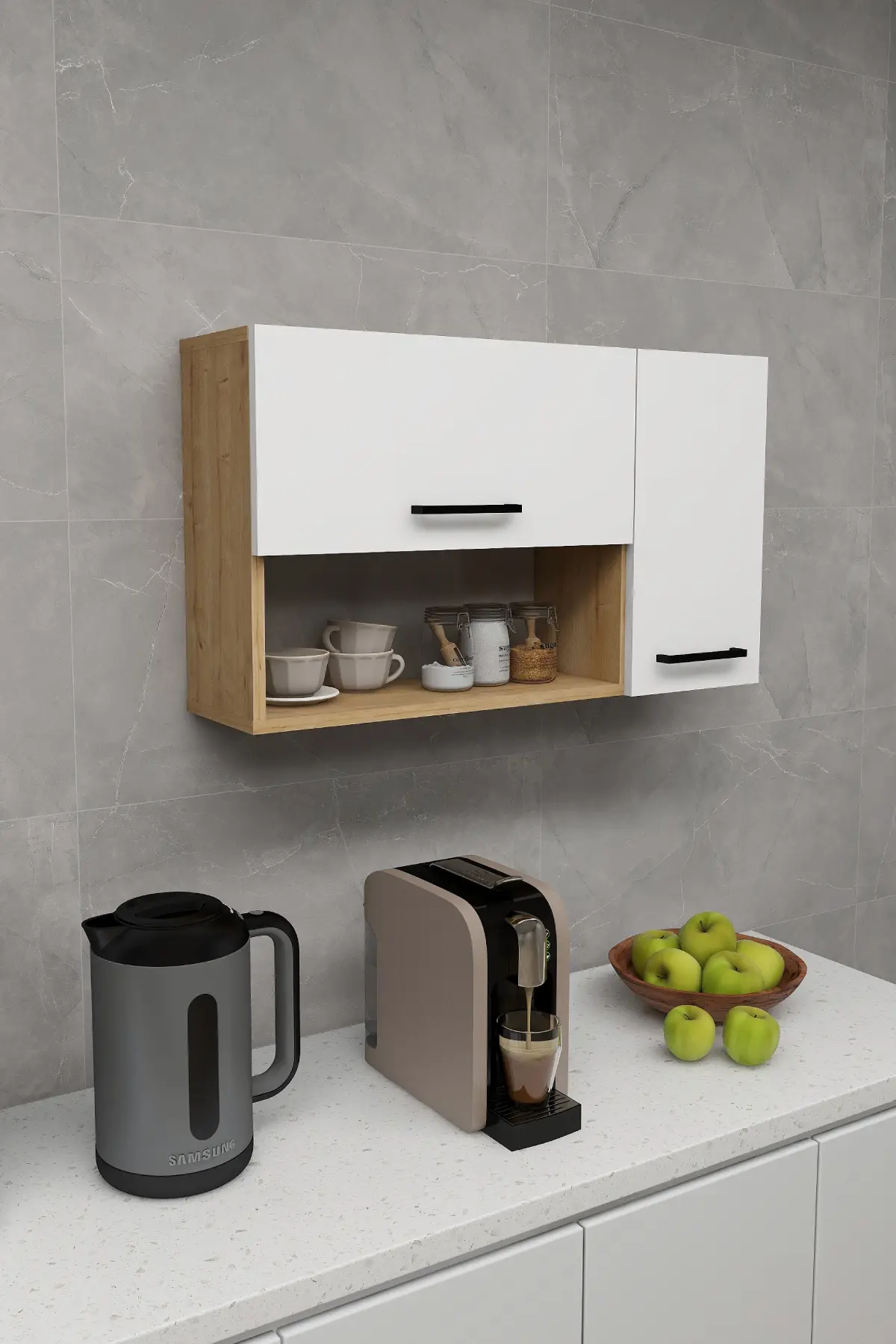 MATERIAL: The product is made of an 18 mm thick high-quality melamine coated particleboard. The manufactured wood surface is water-resistant to some extent and edges are banded with PVC edge banding tape. Cabinet door handles are quality metal. First-class assembly/installation hardware and accessories are used. Our products are produced from E1 certified raw materials that do not contain carcinogenic substances and comply with European Union health norms.