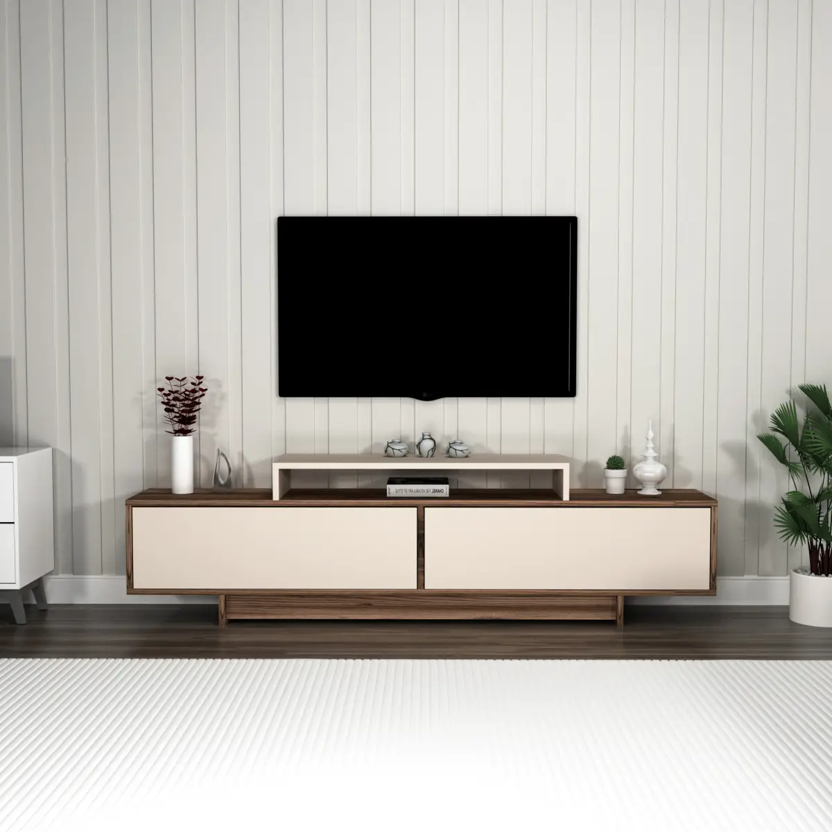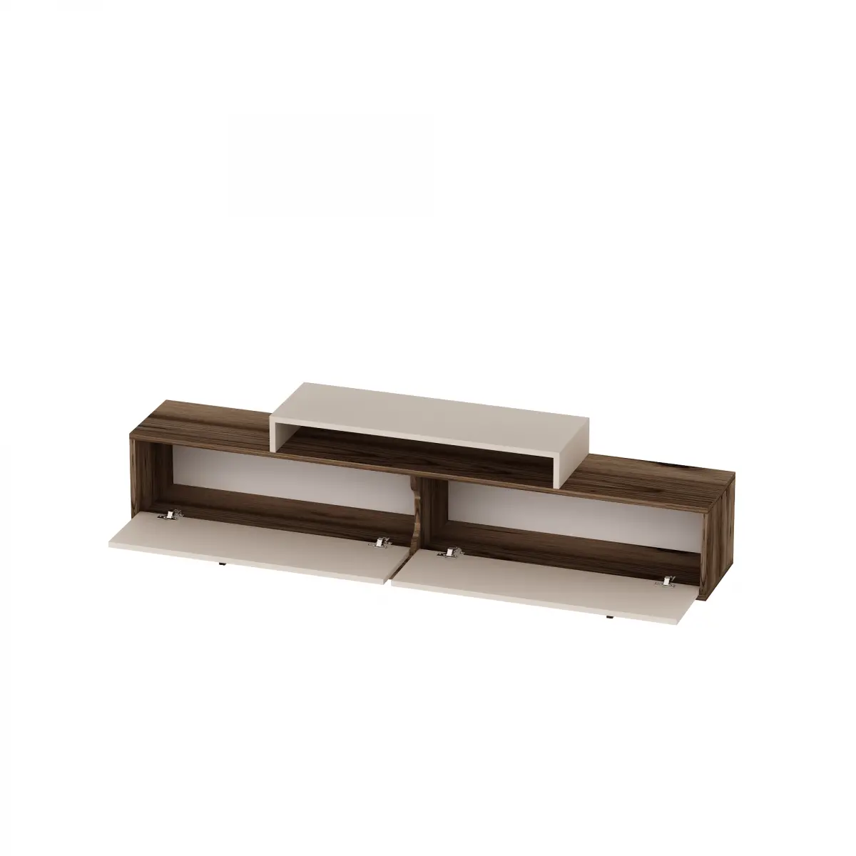 MATERIAL: The TV stand is made of an 18 mm thick high-quality melamine-coated particleboard. The manufactured wood surface is water-resistant to some extent and the edges are banded with PVC edge banding tape. First-class assembly/installation hardware and accessories are used. Our products are produced from certified quality raw materials that do not contain carcinogenic substances and comply with European Union health norms.