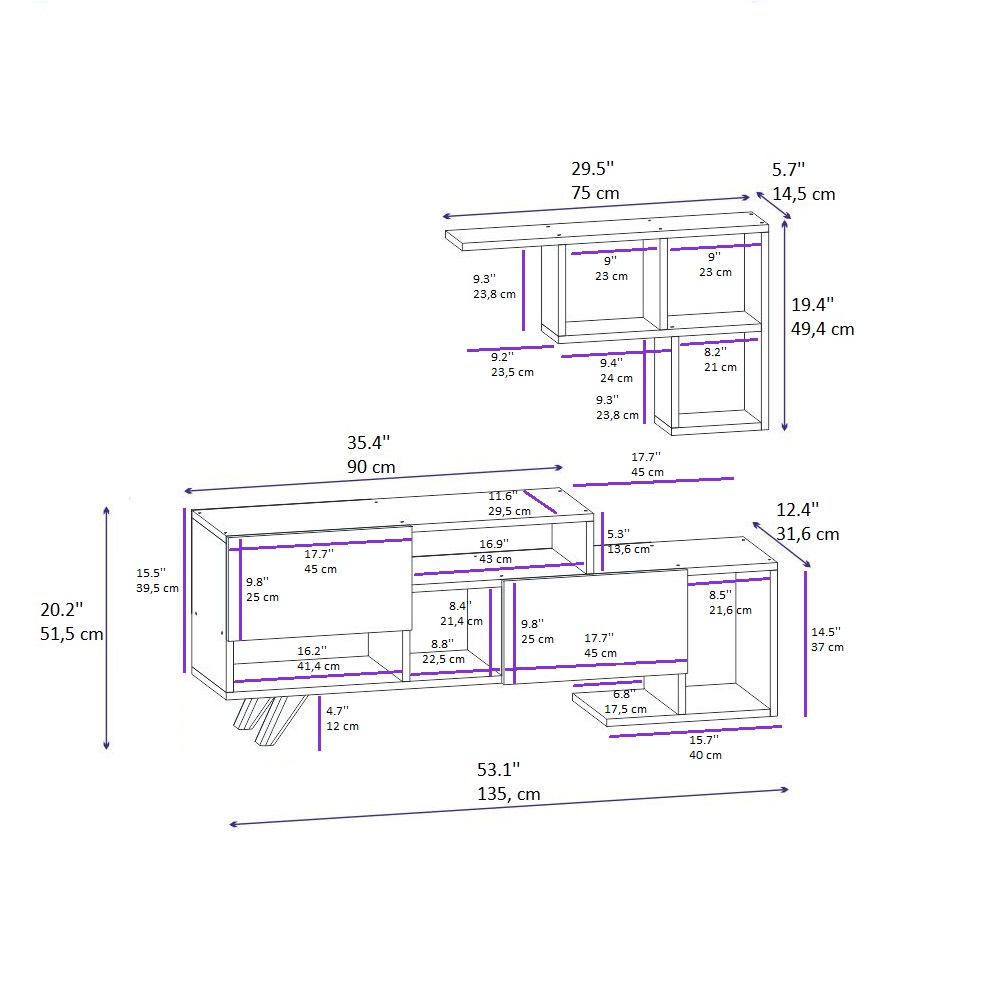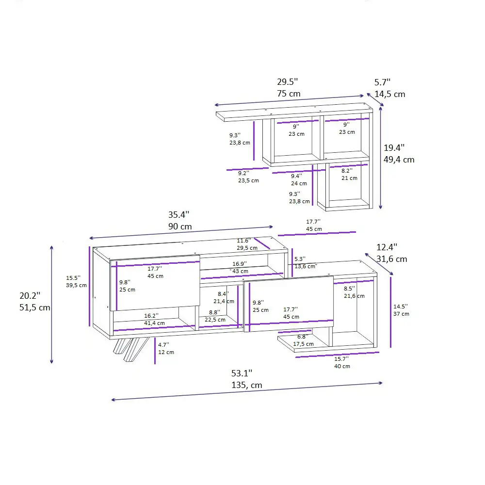 TV Stand HEIGHT: 20.2" / 51.5 cm | WIDTH: 53.1" / 135 cm | DEPTH: 12.4" / 31.6 cm.
